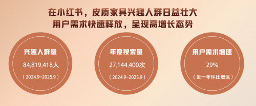 小紅書數(shù)據(jù)顯示,過去一年,皮質(zhì)家具興趣人群已超8481萬,年搜索量2714萬次,需求年增速高達(dá)29%,呈現(xiàn)爆發(fā)式增長。