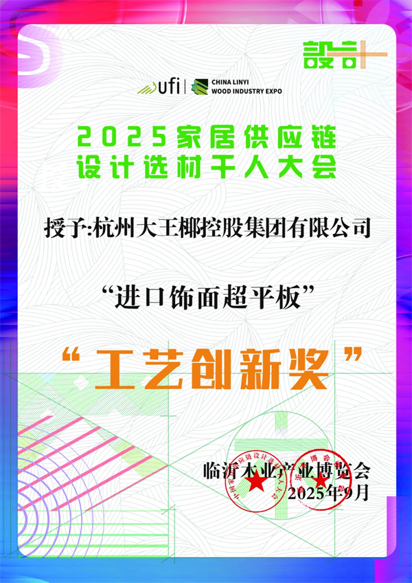 在同期舉辦的2025家居供應(yīng)鏈設(shè)計選材千人大會上,這款引發(fā)飾面美學(xué)價值共鳴的新品,成功斬獲了由組委會頒發(fā)的“工藝創(chuàng)新獎”;從美國Muse設(shè)計鉑金獎、倫敦設(shè)計鉑金獎等六項國際大獎加冕,到再奪業(yè)內(nèi)“工藝創(chuàng)新獎”,大王椰旗艦系列上市的“開掛”之路,本質(zhì)上是一場“美學(xué)&品質(zhì)”升維的破卷突圍戰(zhàn)。