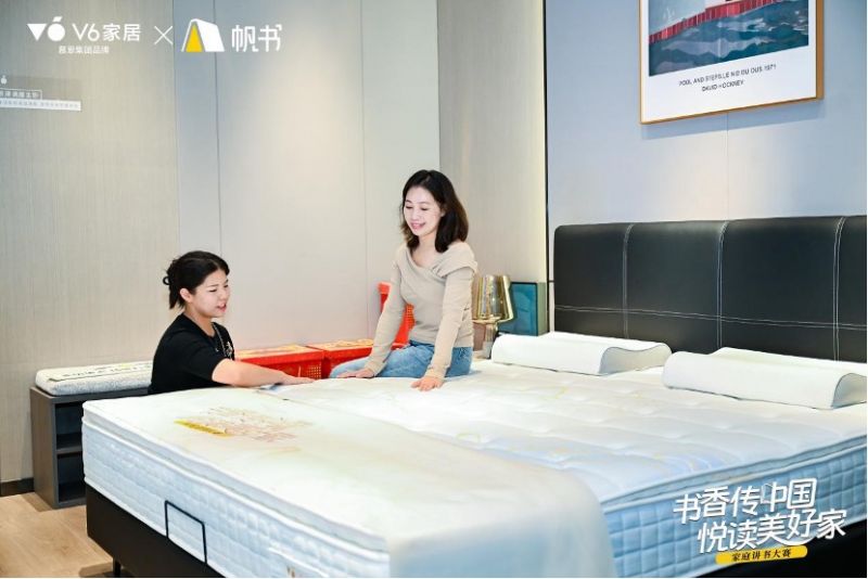 此次家庭講書大賽結(jié)束后,參賽家庭和觀眾朋友們也踴躍參觀了V6家居門店,大家或坐或躺,沉浸式體驗(yàn)萬象夢(mèng)床墊、小勝意床架、貝多芬沙發(fā)等秋季新品,感受高品質(zhì)家庭閱讀場(chǎng)景,書香系列黃金屋、閱讀沙發(fā)等書香系列產(chǎn)品也給大家留下了深刻印象。一位媽媽表示,走進(jìn)這個(gè)空間和自己的孩子一起讀書,有一種時(shí)間慢下來的感覺,這種體驗(yàn)很獨(dú)特。