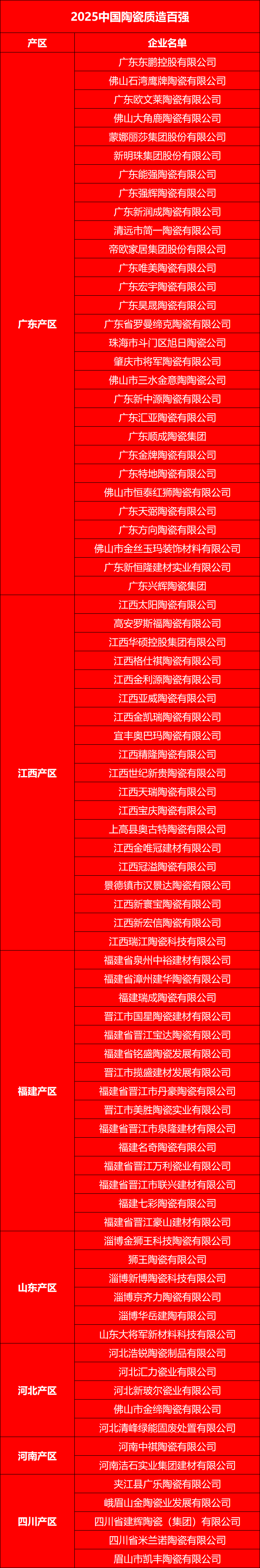 作為對(duì)中國陶瓷堅(jiān)守品質(zhì)企業(yè)的致敬,大會(huì)隆重發(fā)布、授牌了“2025中國陶瓷質(zhì)造百強(qiáng)” 榜單并進(jìn)行了授牌儀式,這些行業(yè)頭部企業(yè)、產(chǎn)區(qū)實(shí)力企業(yè)入選: