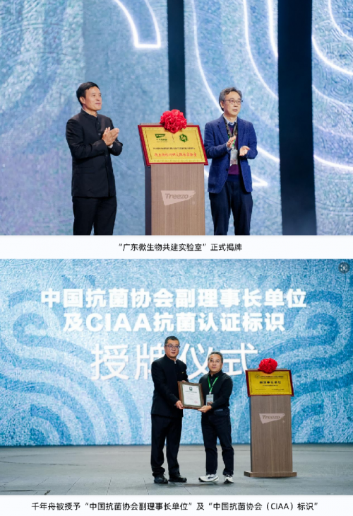 會(huì)上,千年舟被授予“中國(guó)抗菌協(xié)會(huì)副理事長(zhǎng)單位”及“中國(guó)抗菌協(xié)會(huì)(CIAA)標(biāo)識(shí)”,“廣東微生物共建實(shí)驗(yàn)室”正式揭牌,“中國(guó)室內(nèi)健康環(huán)境創(chuàng)新平臺(tái)”正式啟動(dòng),全面展現(xiàn)千年舟在健康、科技領(lǐng)域的創(chuàng)新力與引領(lǐng)力。