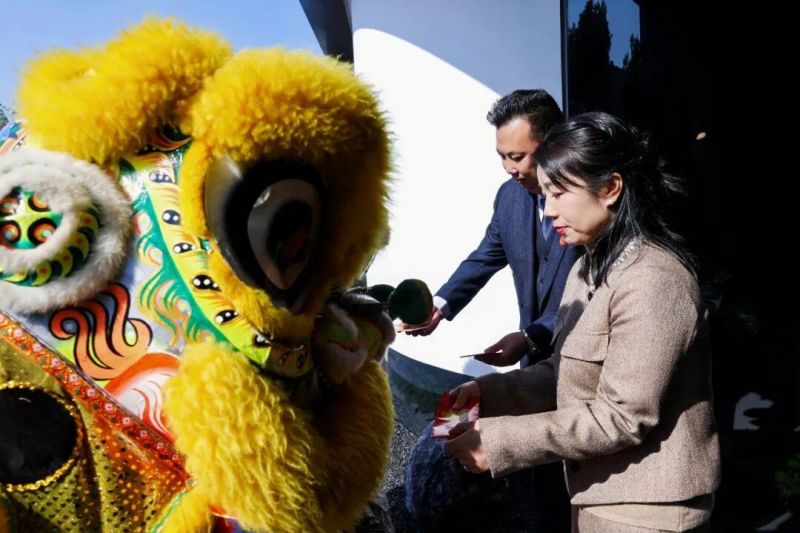 典禮現(xiàn)場,祥獅歡舞,采青納吉。易航燈飾創(chuàng)始人秦瑞與夫人蔣園園共同接“青”,為新店接福迎財,將開業(yè)氛圍推向高潮。