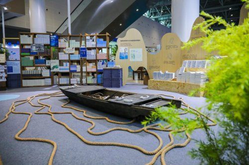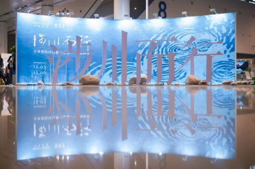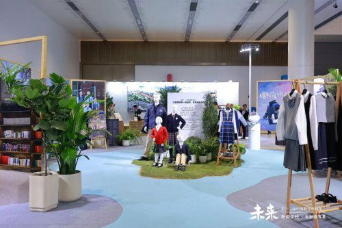 會(huì)場(chǎng)一隅,伊頓紀(jì)德品牌藝術(shù)展“涉川而行·全世界的河流都會(huì)重逢,一如我和你”以河流、島鏈、漣漪為核心意象,串聯(lián)起“一滴水的澄澈與明亮”“一方池塘的共生共茂”“所謂伊人,在水一方”“打開明亮的日?!彼亩温贸?,以“文以載道”與“衣以載道”為線索,以行動(dòng)致敬美好教育。