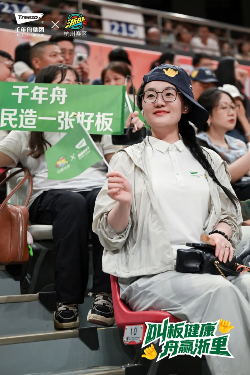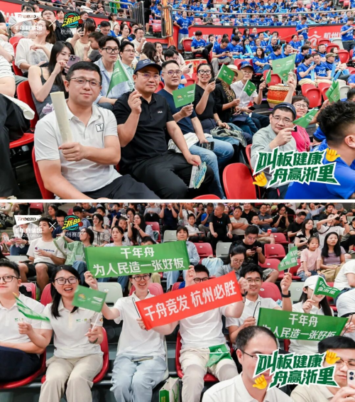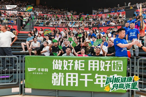 比賽期間,走進體育館,千年舟亮眼的健康綠,妥妥的賽場顯眼包。還有集團執(zhí)行總經理田茂華率隊親臨現(xiàn)場觀賽,用歡呼與手中晃動的橫幅,為比賽加油吶喊,并傳遞千年舟的品牌力量。