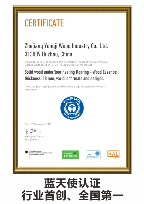 近日,永吉地板傳來(lái)重磅喜訊——產(chǎn)品憑借卓越的環(huán)保性能與嚴(yán)苛的品質(zhì)把控,成功斬獲全球首個(gè)且最具權(quán)威性的環(huán)保認(rèn)證體系——藍(lán)天使認(rèn)證(Blauer Engel),一舉創(chuàng)下行業(yè)首創(chuàng) 全國(guó)第一的榮譽(yù)。