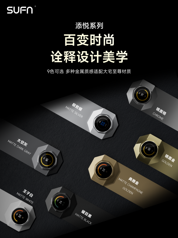 多維度美學定制體系——產品提供多達9種高級金屬質感配色和兩種材質選擇,包括奢華大氣的不銹鋼材質和簡約時尚的鋁合金材質,能夠完美適配古典風格與現(xiàn)代簡約風格空間,滿足別墅大宅業(yè)主多樣化的審美需求。