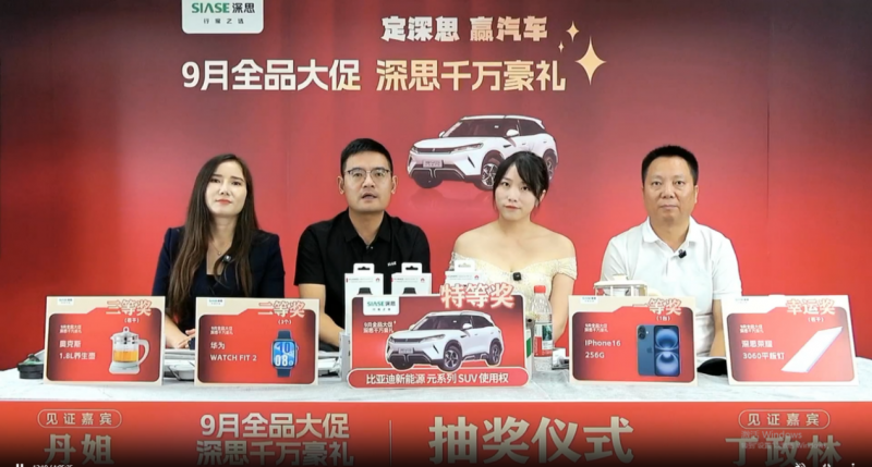 9月金秋,湖南深思電工實(shí)業(yè)有限公司以“千萬豪禮”為引擎,發(fā)起覆蓋全國(guó)終端門店的全品大促活動(dòng)。當(dāng)全國(guó)抽獎(jiǎng)直播的鏡頭對(duì)準(zhǔn)特等獎(jiǎng)中獎(jiǎng)編號(hào)時(shí),這場(chǎng)貫穿整月、橫跨線上線下的深度聯(lián)動(dòng),迎來了它的高光時(shí)刻!浙江麗水的王總在全國(guó)抽獎(jiǎng)直播間抽中比亞迪SUV(使用權(quán)),成為渠道伙伴羨慕的“幸運(yùn)錦鯉”。