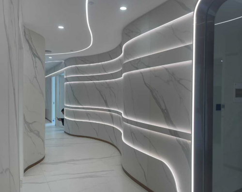 熱彎后的巖板可以應(yīng)用于多種場景,如圓形穹頂、回廊、弧形背景墻、圓包柱、旋轉(zhuǎn)樓梯等,為建筑和室內(nèi)設(shè)計(jì)提供了更多獨(dú)特的設(shè)計(jì)美感。