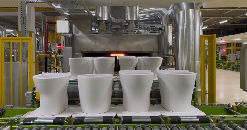 工廠秉承環(huán)境友好的目標(biāo),在生產(chǎn)工序間的產(chǎn)品搬運全部實現(xiàn)了自動化,同時大量采用機器人作業(yè)。在環(huán)保方面導(dǎo)入脫硫脫硝裝置、水循環(huán)利用裝置,以及太陽能發(fā)電等。其中,燒成用輥道窯是TOTO集團海外公司首次引進(jìn),該窯爐使用可以旋轉(zhuǎn)的滾筒,將放在燒成用的板材上的產(chǎn)品自動搬運、通過最高1200度的高溫21小時自動燒成;高絕熱的燒成窯能量損失很少,通過冷卻過程中加熱的空氣和廢熱再利用來削減燃料,提高生產(chǎn)效率和能源效率,同時也大幅削減了二氧化碳的排放。