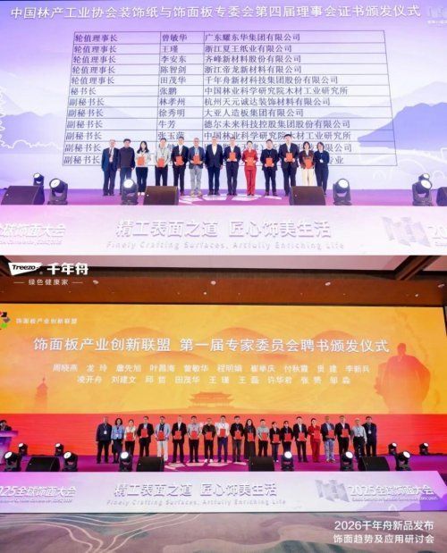 會(huì)上,千年舟集團(tuán)執(zhí)行總經(jīng)理田茂華獲頒中國林產(chǎn)工業(yè)協(xié)會(huì)裝飾紙與飾面板專委會(huì)第四屆理事會(huì)證書、飾面板產(chǎn)業(yè)創(chuàng)新聯(lián)盟專家委員會(huì)證書,雙重榮譽(yù)彰顯了行業(yè)對(duì)千年舟品牌影響力與專業(yè)實(shí)力的高度認(rèn)可。