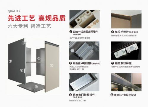 玖奈擁有六大專利技術(shù),包括四合一拉條固定預(yù)埋件、鋁合金M4預(yù)埋件、鋁合金門鉸預(yù)埋件、免拉手設(shè)計、鋁拉條鉸杯座和底板45°免拉手設(shè)計。這些專利技術(shù)實現(xiàn)了結(jié)構(gòu)牢固、安裝便捷、防門下垂、防蟲美觀等實用功能,為產(chǎn)品耐用性提供堅實保障。